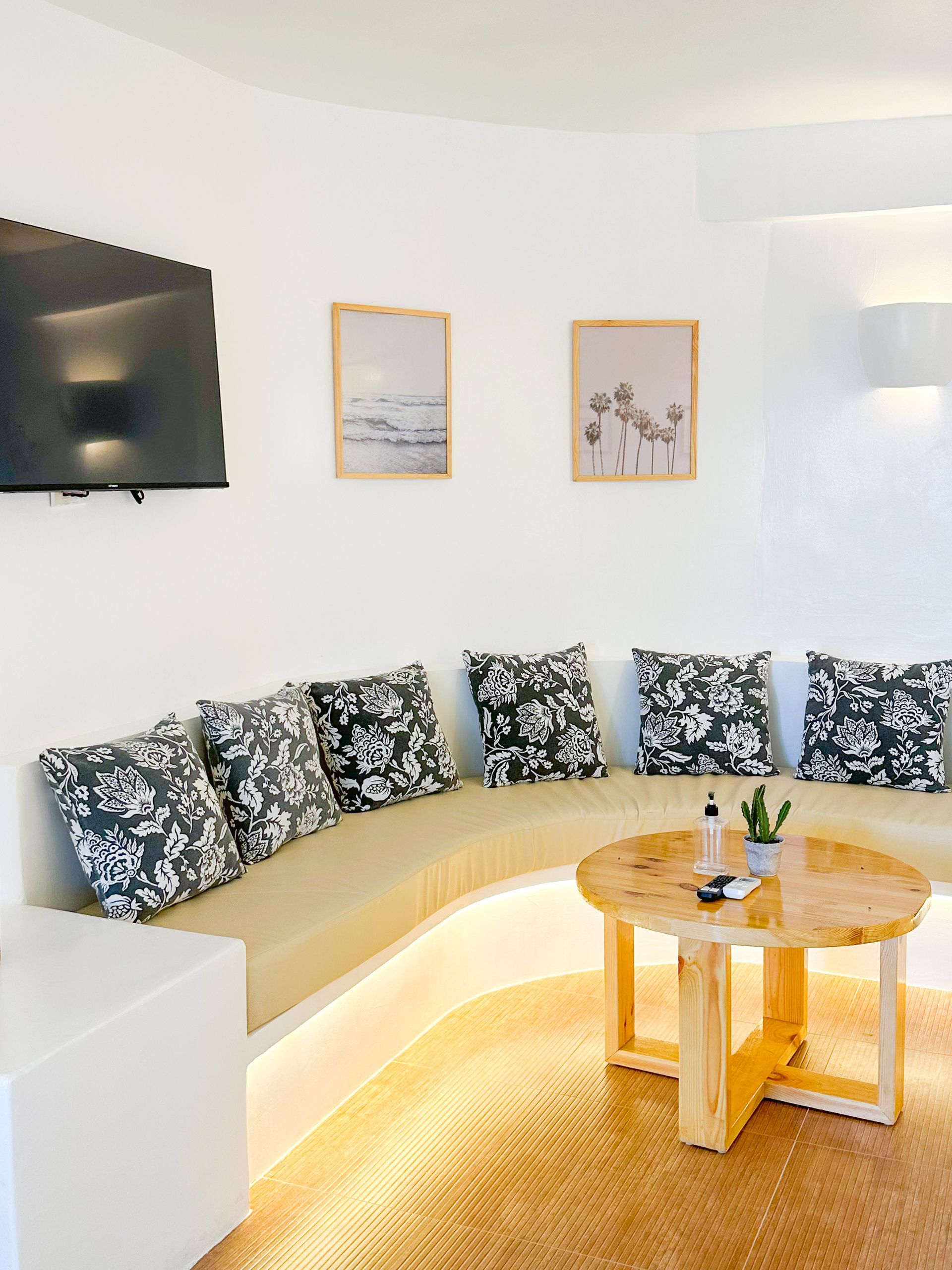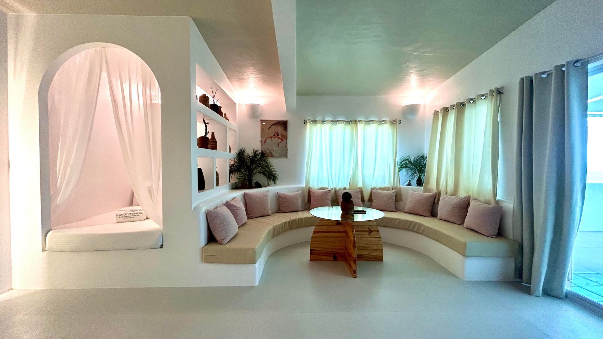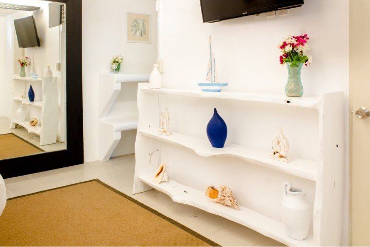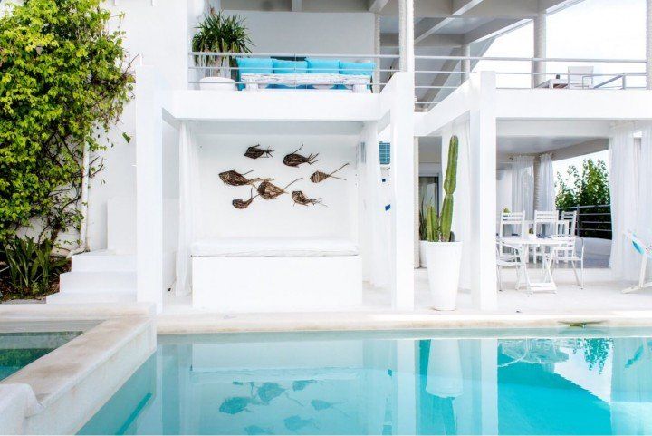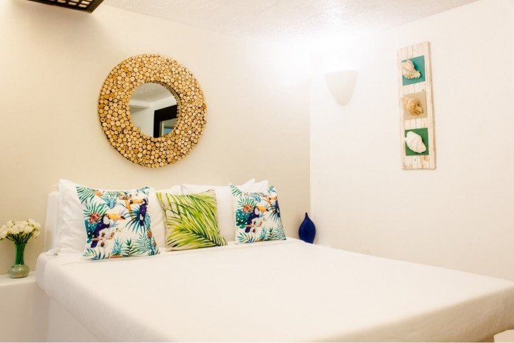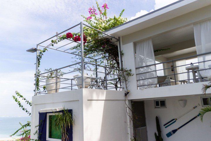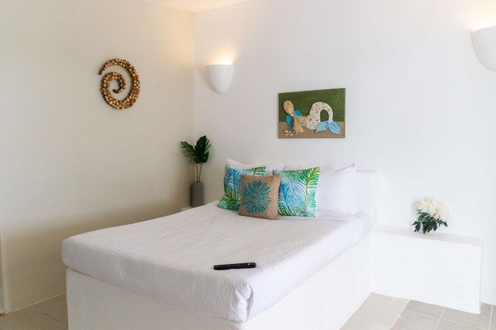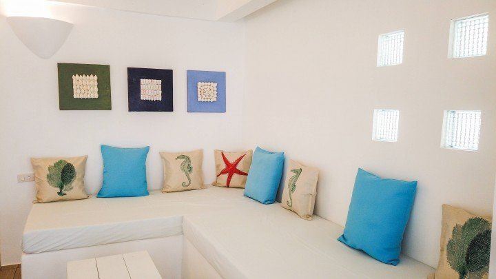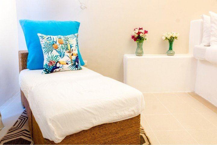 We invite you to let your troubles melt away in this quaint, Santorini inspired Villa. Cook your favorite meals in the fully equipped kitchen, and enjoy them in the cozy Moroccan Salon living room area. Or why not make use of the grill on the spacious, private balcony, with its breathtaking view over the common infinity pool and the ocean.