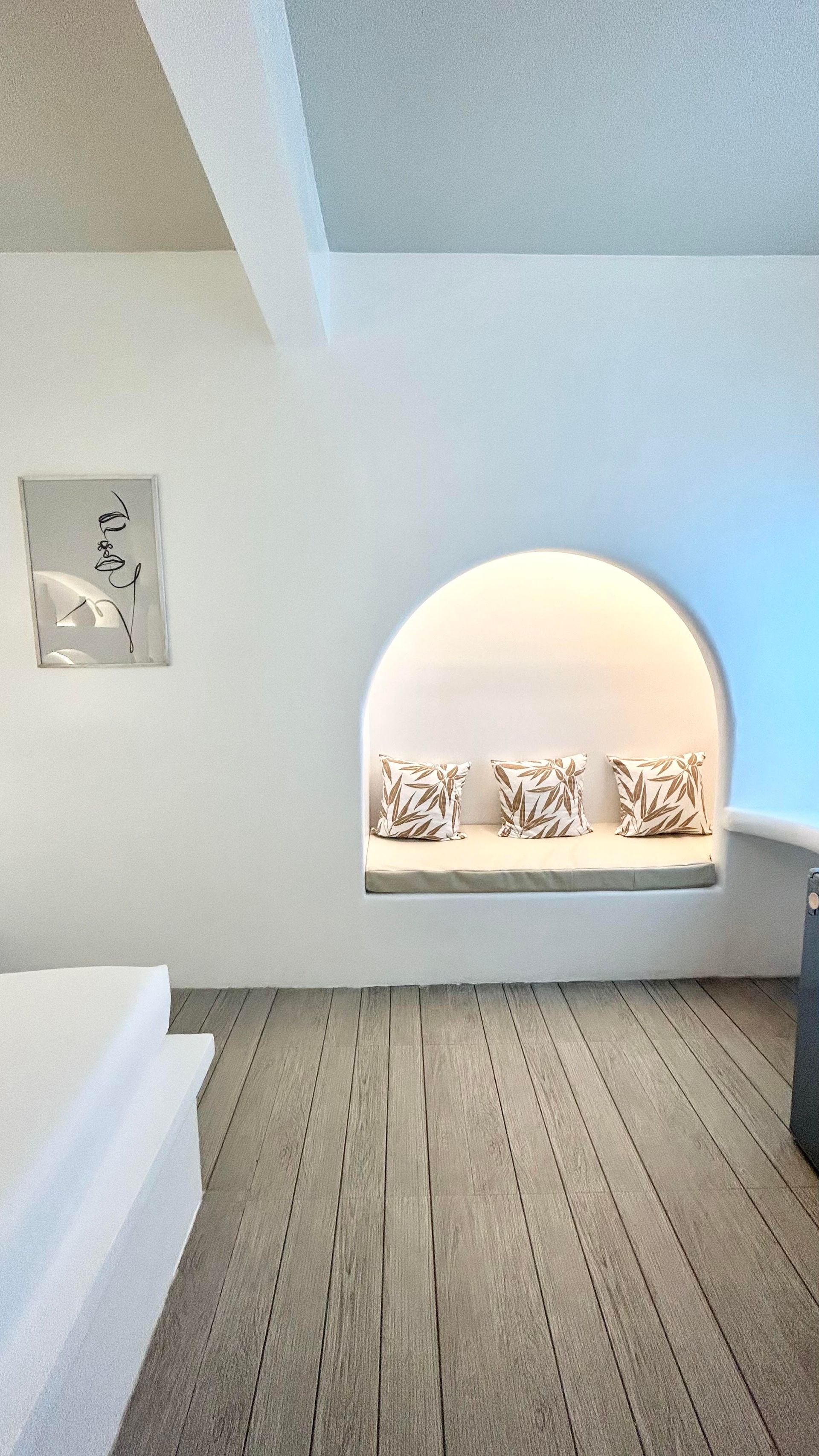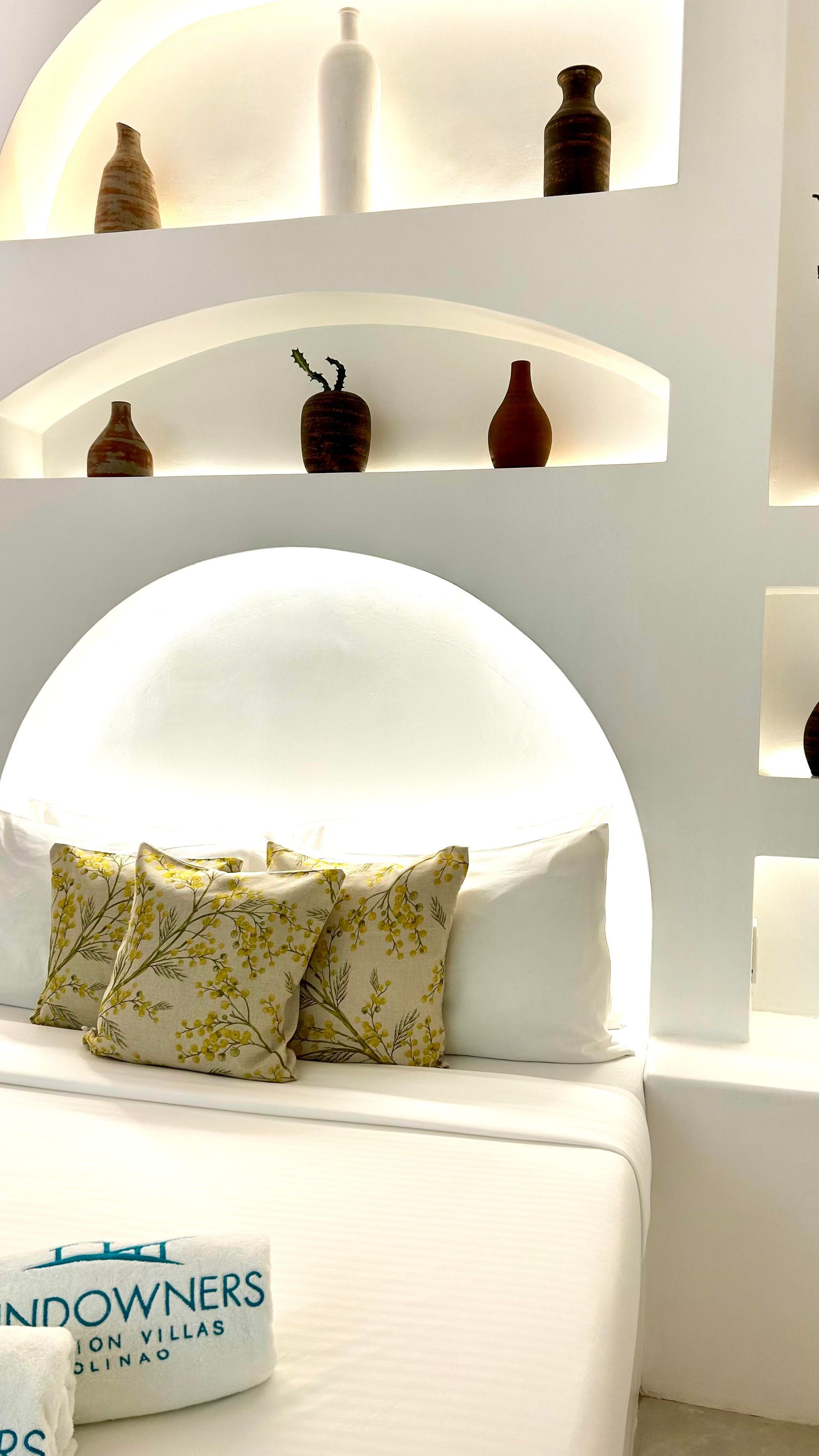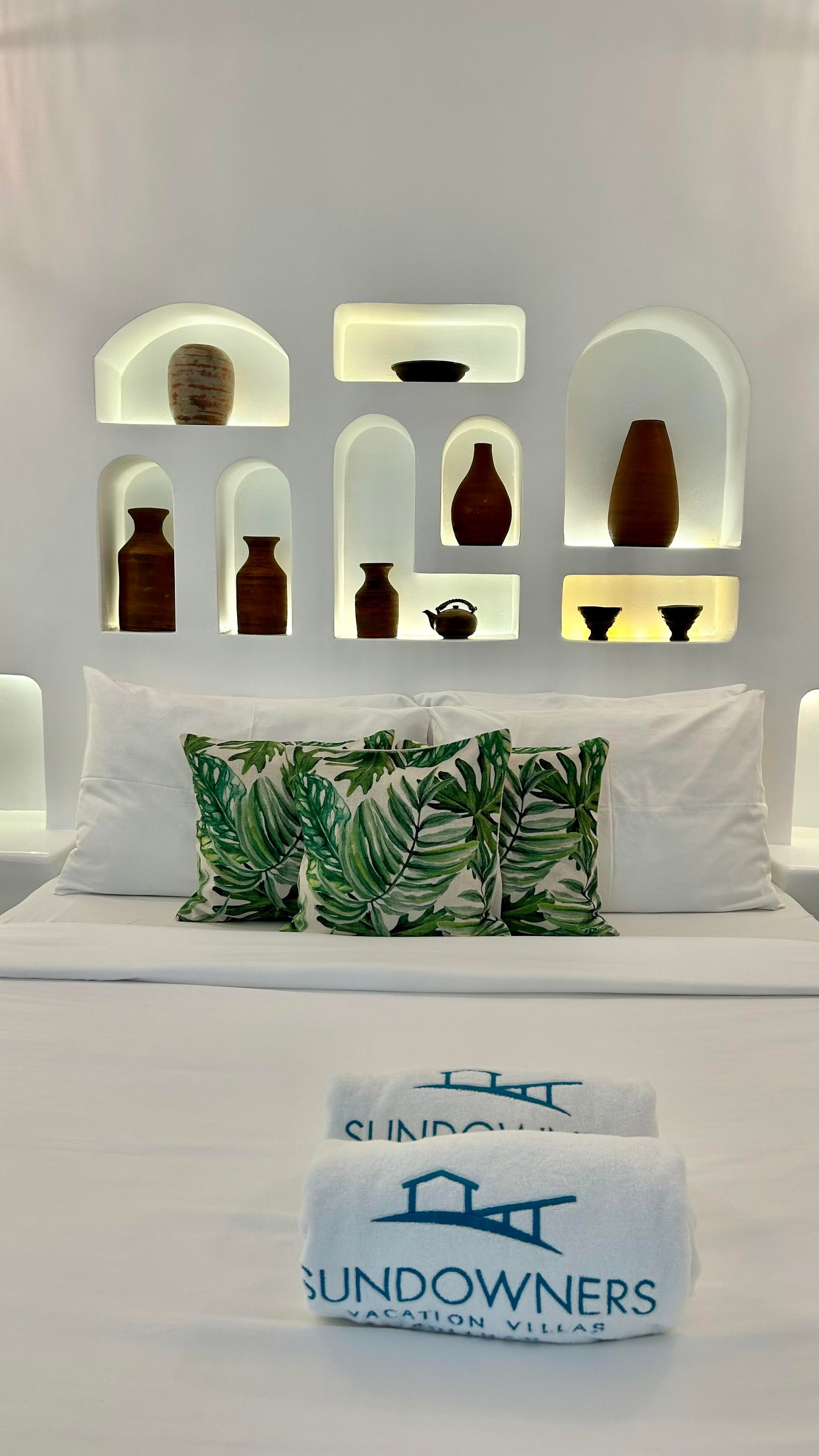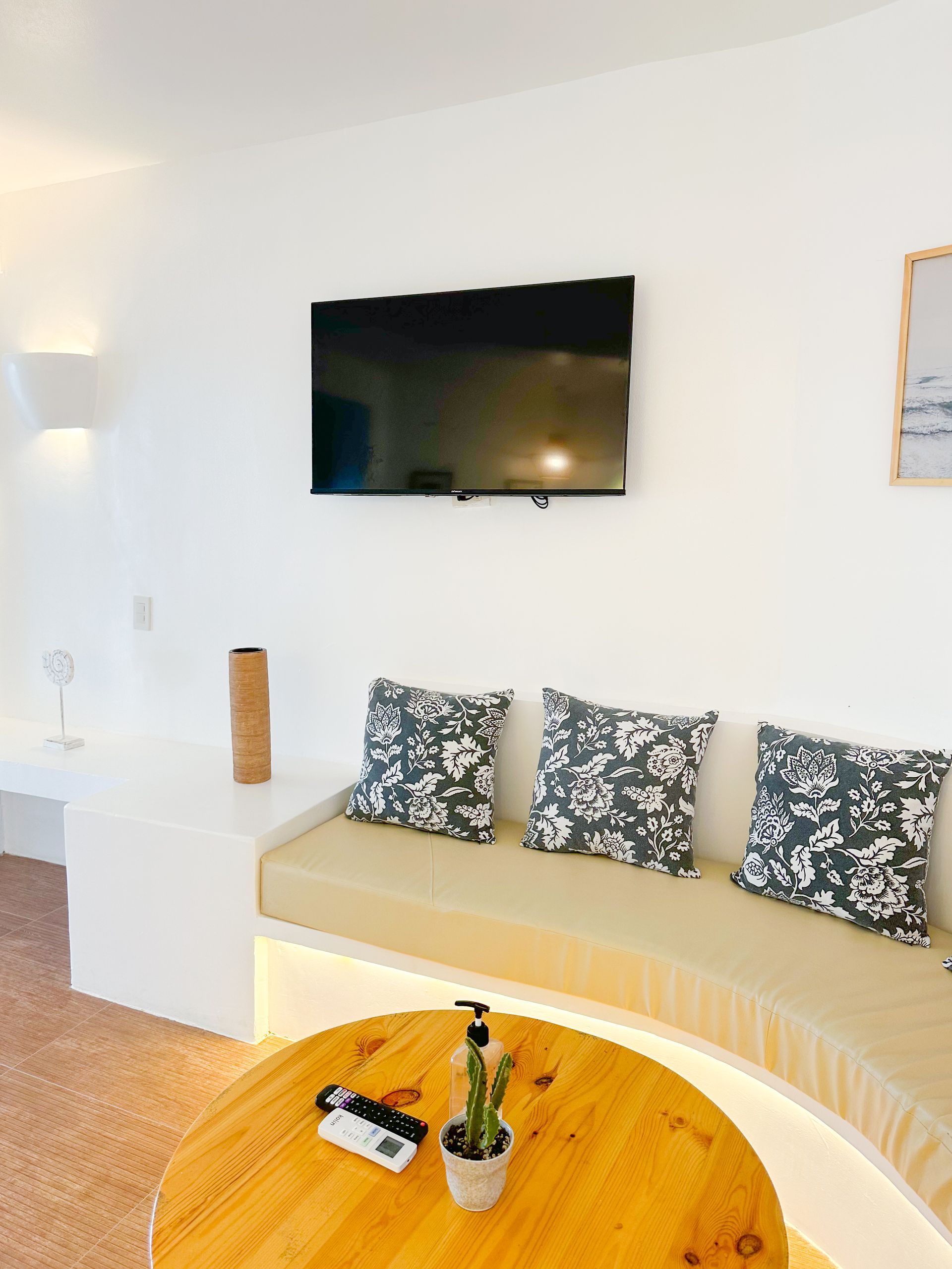 We invite you to let your troubles melt away in this quaint, Santorini inspired Villa. Cook your favorite meals in the fully equipped kitchen, and enjoy them in the cozy Moroccan Salon living room area. Or why not make use of the grill on the spacious, private balcony, with its breathtaking view over the common infinity pool and the ocean.