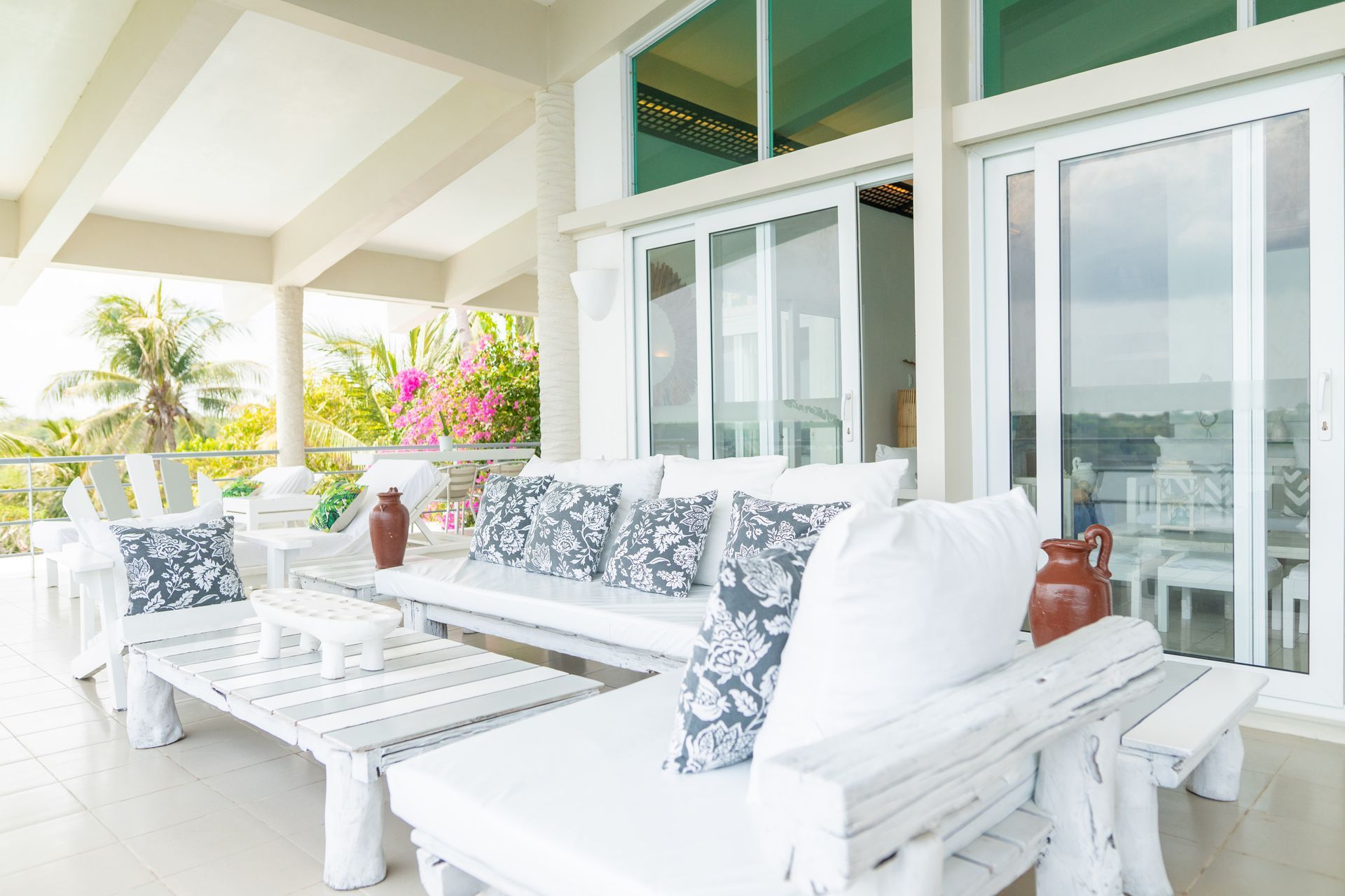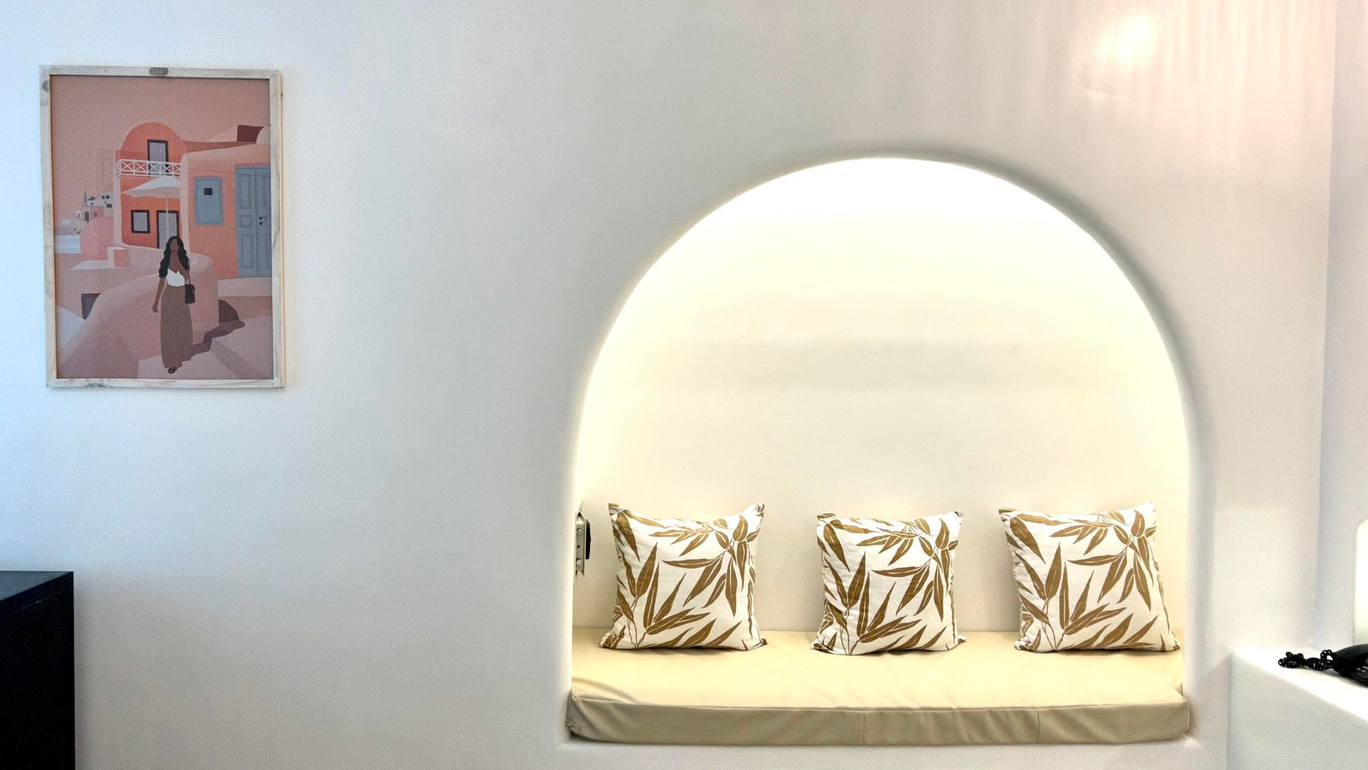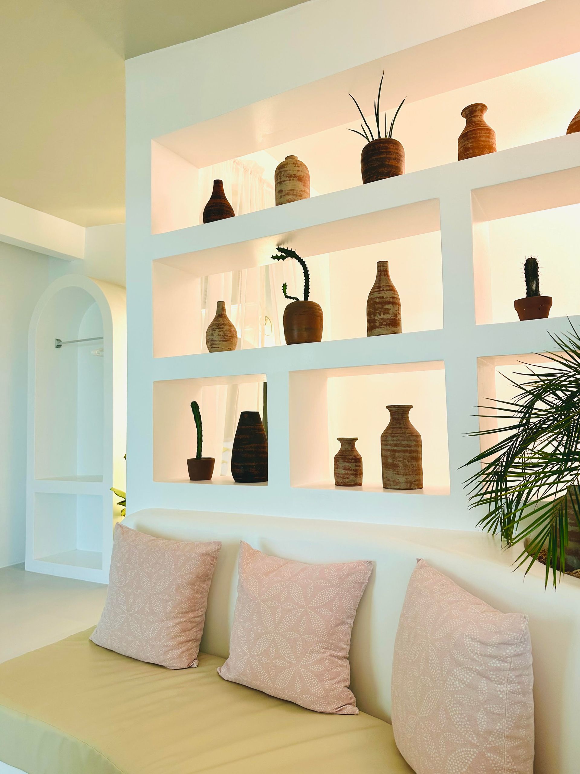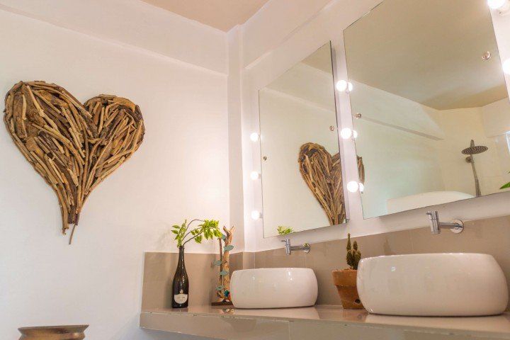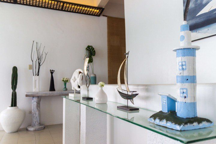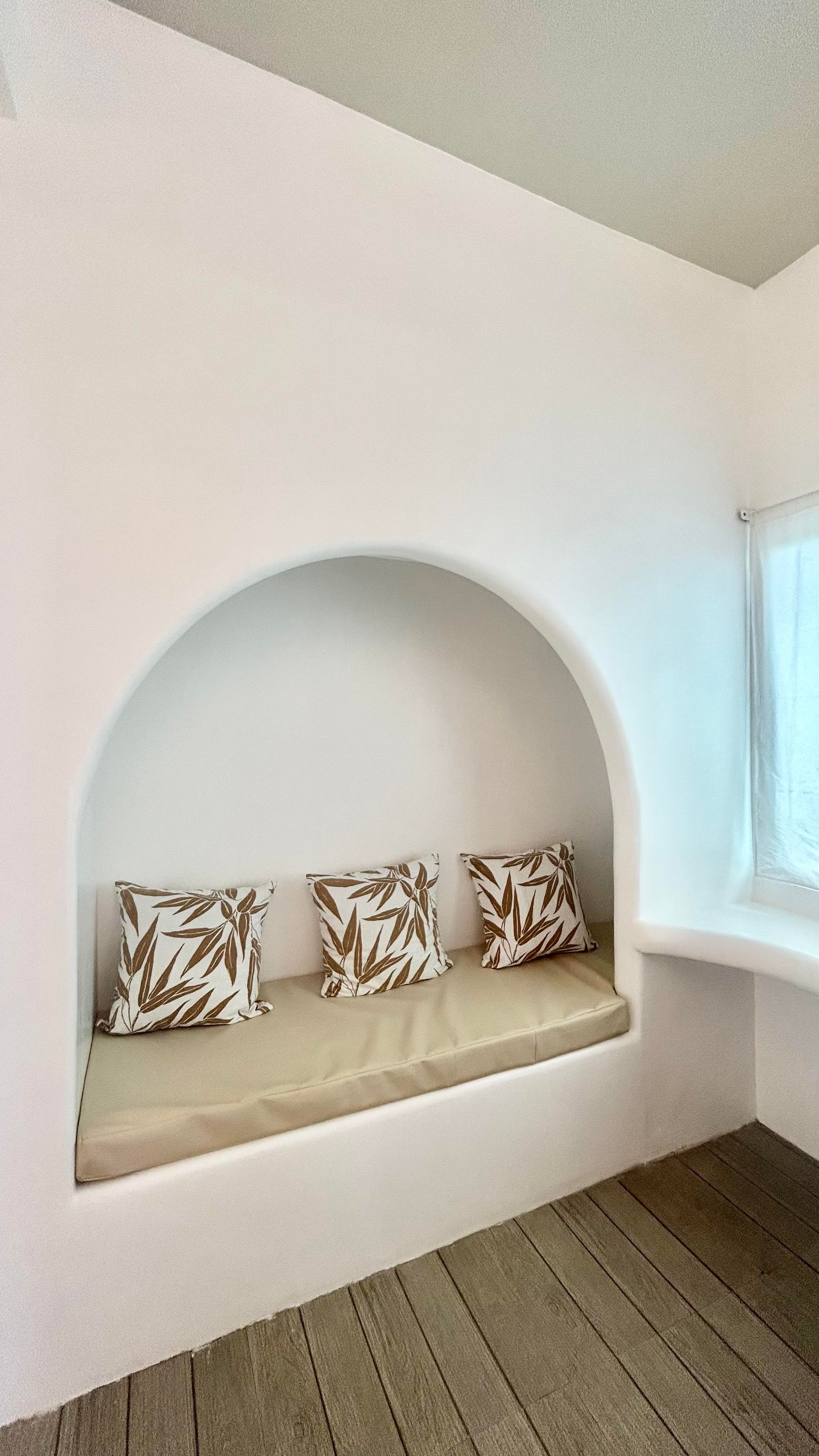 We invite you to let your troubles melt away in this quaint, Santorini inspired Villa. Cook your favorite meals in the fully equipped kitchen, and enjoy them in the cozy Moroccan Salon living room area. Or why not make use of the grill on the spacious, private balcony, with its breathtaking view over the common infinity pool and the ocean.
