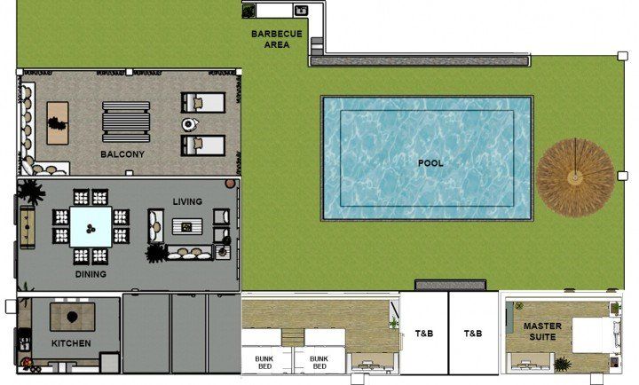 Inside, the villa unfolds into six elegantly designed rooms, each a sanctuary of comfort and style. The configuration includes three airy twin rooms with two queen-sized beds each, a tropical family room with additional bunks, a cozy single room with a queen bed, and a luxurious master suite featuring a private, open-air shower for an intimate connection with nature. The villa’s thoughtful layout ensures that every guest experiences both privacy and togetherness, with communal spaces that invite engagement—whether cooking in the well-equipped kitchen, dining al fresco on the poolside patio, or lounging in the opulent indoor living area. Book your stay and transform your holiday into a memorable retreat where luxury meets the lull of the ocean.